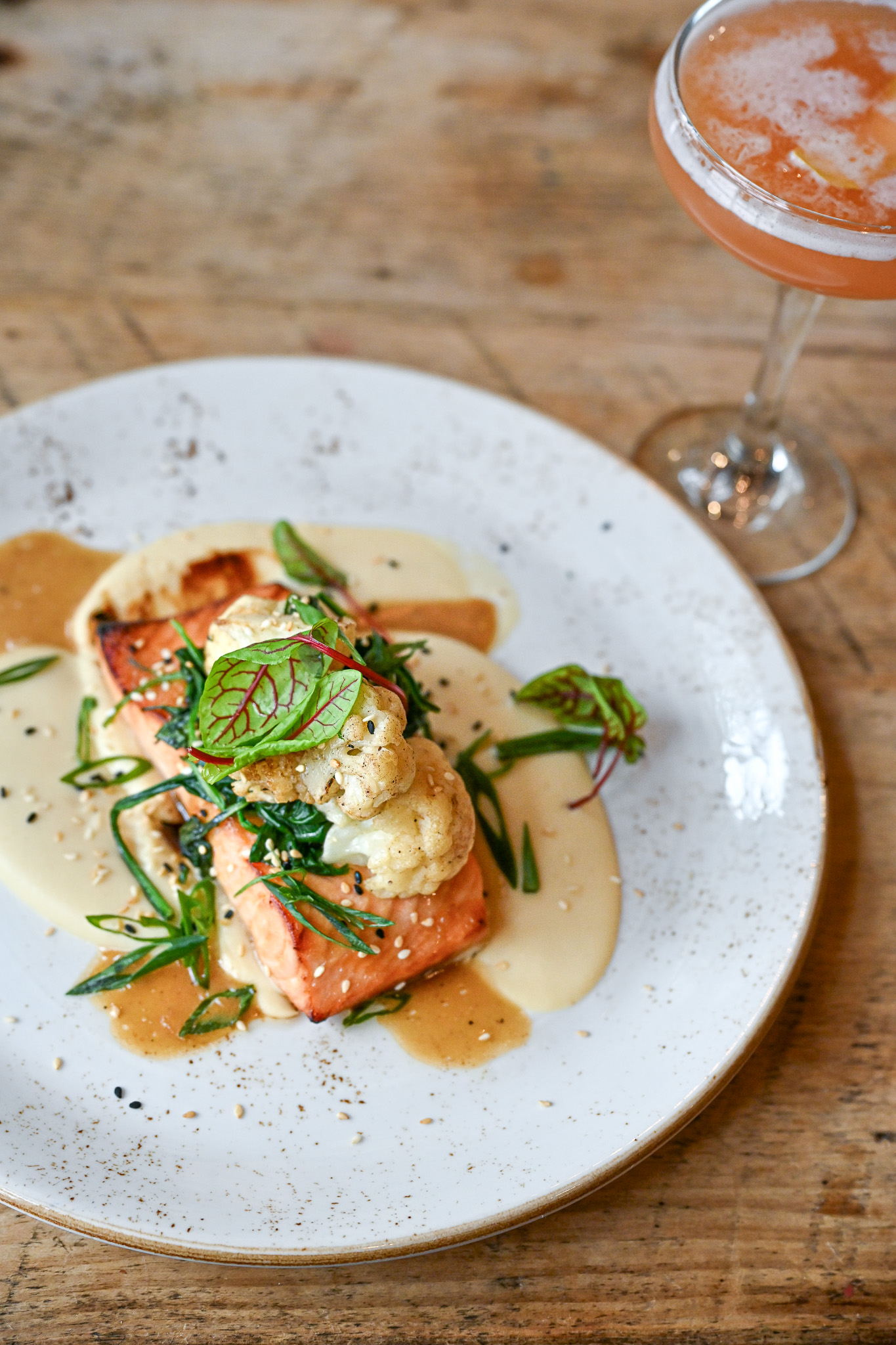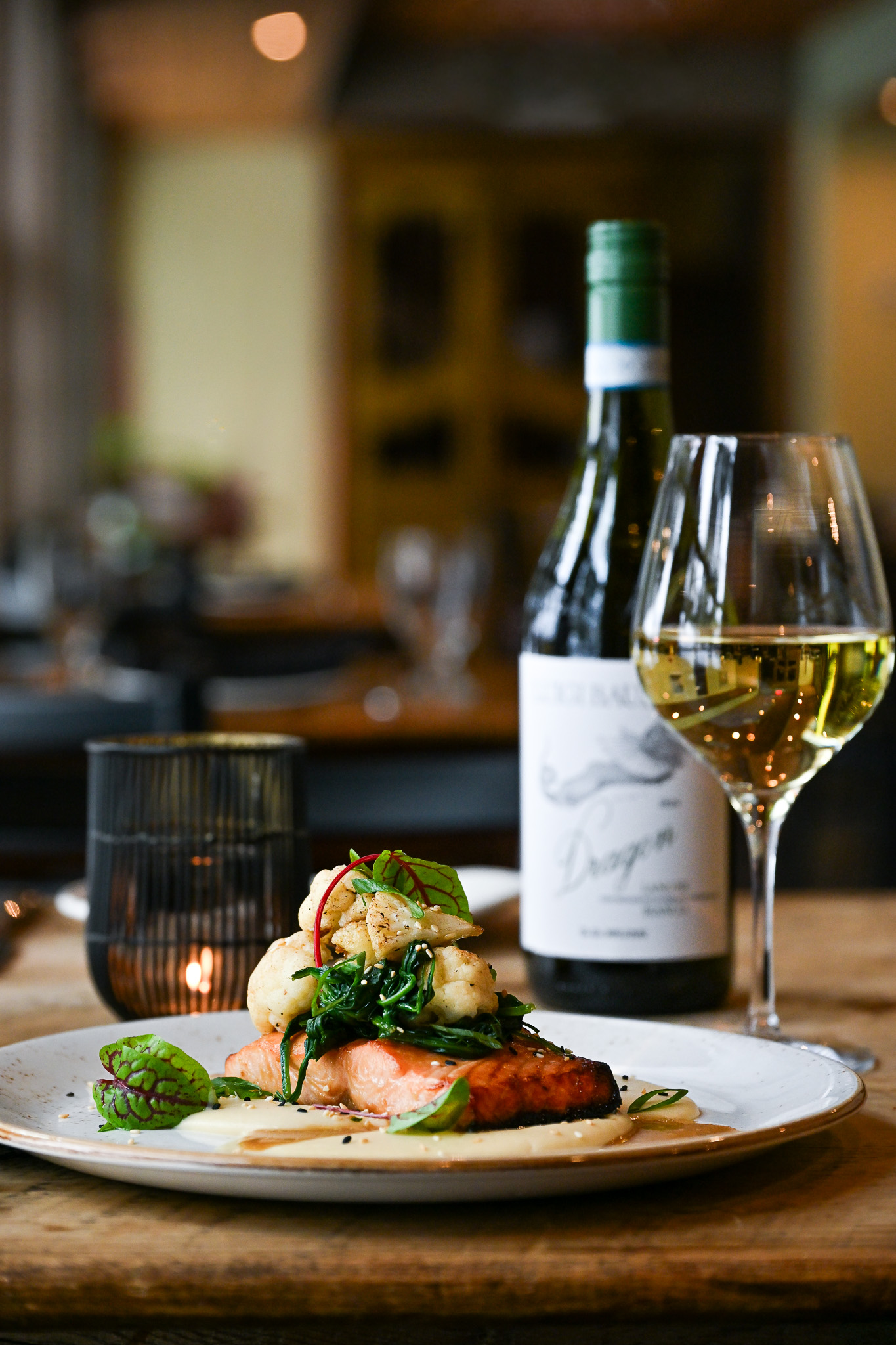 If your mood and palette call for something a little lighter and nutrition-forward, the new Asian-fusion-inspired Slow Baked Salmon might be my favorite iteration of this menu staple (and is my favorite new winter menu addition). Showcasing Chef Phil’s creative mastery with seafood, the salmon is marinated in sake, then perfectly baked low and slow before a final broil for crispy edges. It’s served with a cauliflower purée—shallots, butter, and cauliflower blended with a touch of heavy cream and miso paste. Miso-roasted cauliflower adds depth, while a soy sherry vinaigrette, sautéed spinach, and sorrel provide brightness and balance.