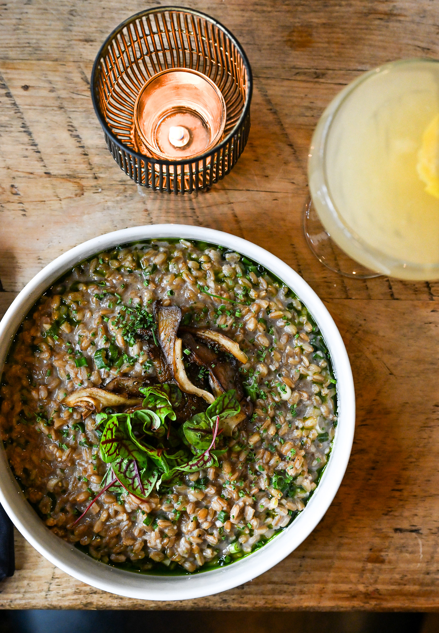 Pair this with The Bears Pears from the craft cocktail menu to offer a pop of bright acidity and a touch of sweetness, perfectly balancing the rich umami of the Farrotto. Shaken with honey from hives on the property, fresh pear puree, lemon, and Citadel gin, The Bears Pears add a refreshing hint of brightness to the earthy properties of the dish.